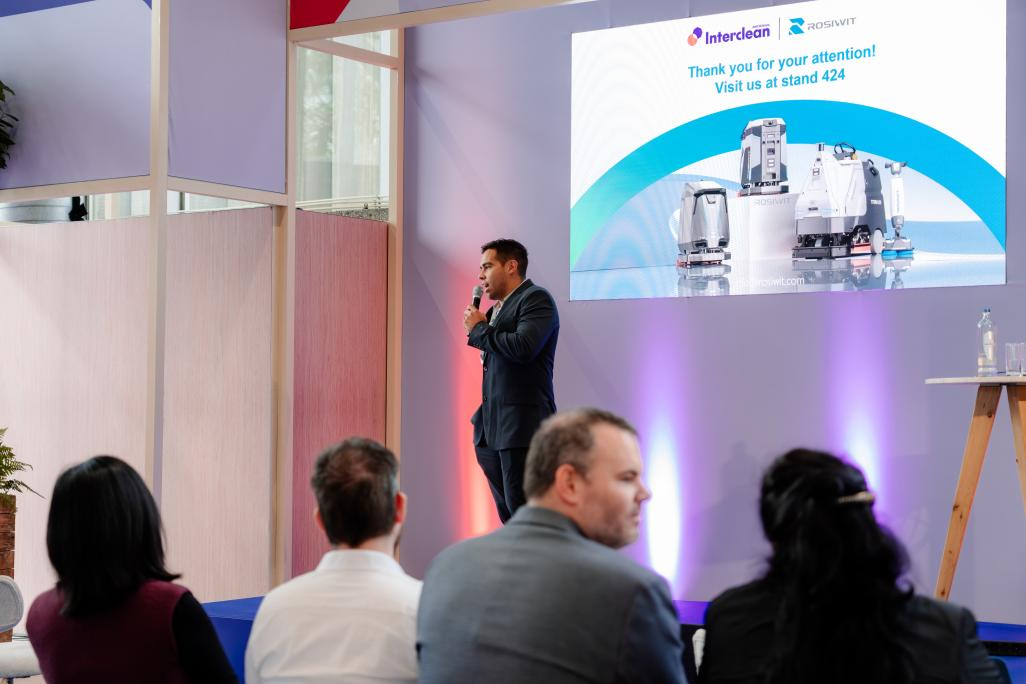 展会期间,Rosiwit 霞智科技围绕“环境责任、管理效率、员工健康与安全”三大核心议题发表主题演讲。其中,“环境责任”成为全场焦点。公司提出以“重机械、轻化学”为核心的清洁理念,通过 Skywalker 机器人高达33kg的对地压力系统,在确保卓越清洁效果的同时,大幅减少水资源消耗与化学清洁剂使用,为工业清洁注入更具可持续性的解决方案。